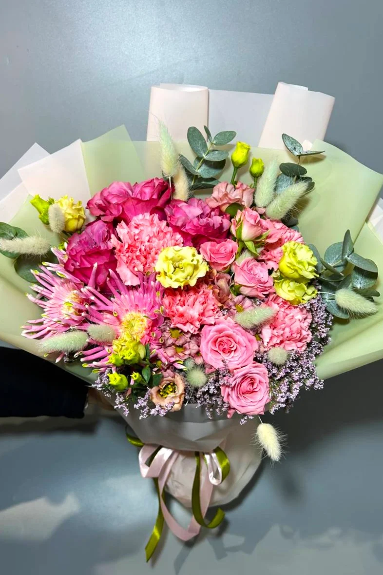 Bukiet mieszany w różowych tonach to idealna kompozycja stworzona z najświeższych kwiatów. Wyselekcjonowane rośliny tworzą harmonijną całość, która zachwyca swoim blaskiem. Ten zestaw sprawdzi się doskonale jako prezent na urodziny lub imieniny bliskiej osoby.